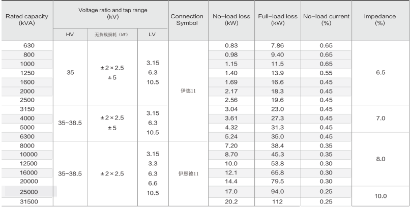 35kV 630kVA~31500kVA三相双绕组无励磁调压电力变压器
